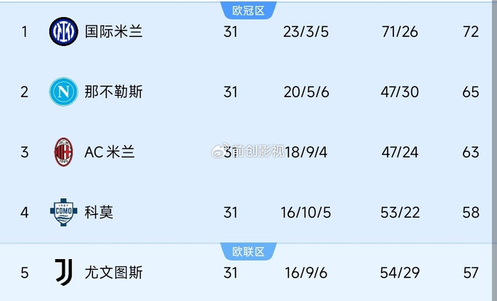 这场比赛过后,意甲争冠格局彻底变了。此前大家普遍认为是国米和米兰的双雄争霸,如今直接变成三足鼎立,而米兰反倒成了掉队风险最大的那一个。目前积分榜上,国米以69分稳居榜首,手握6分的领先优势,夺冠主动权牢牢在握;那不勒斯赢球后积65分升至第二,紧紧咬住榜首不放;米兰则跌至63分,排在第三位。